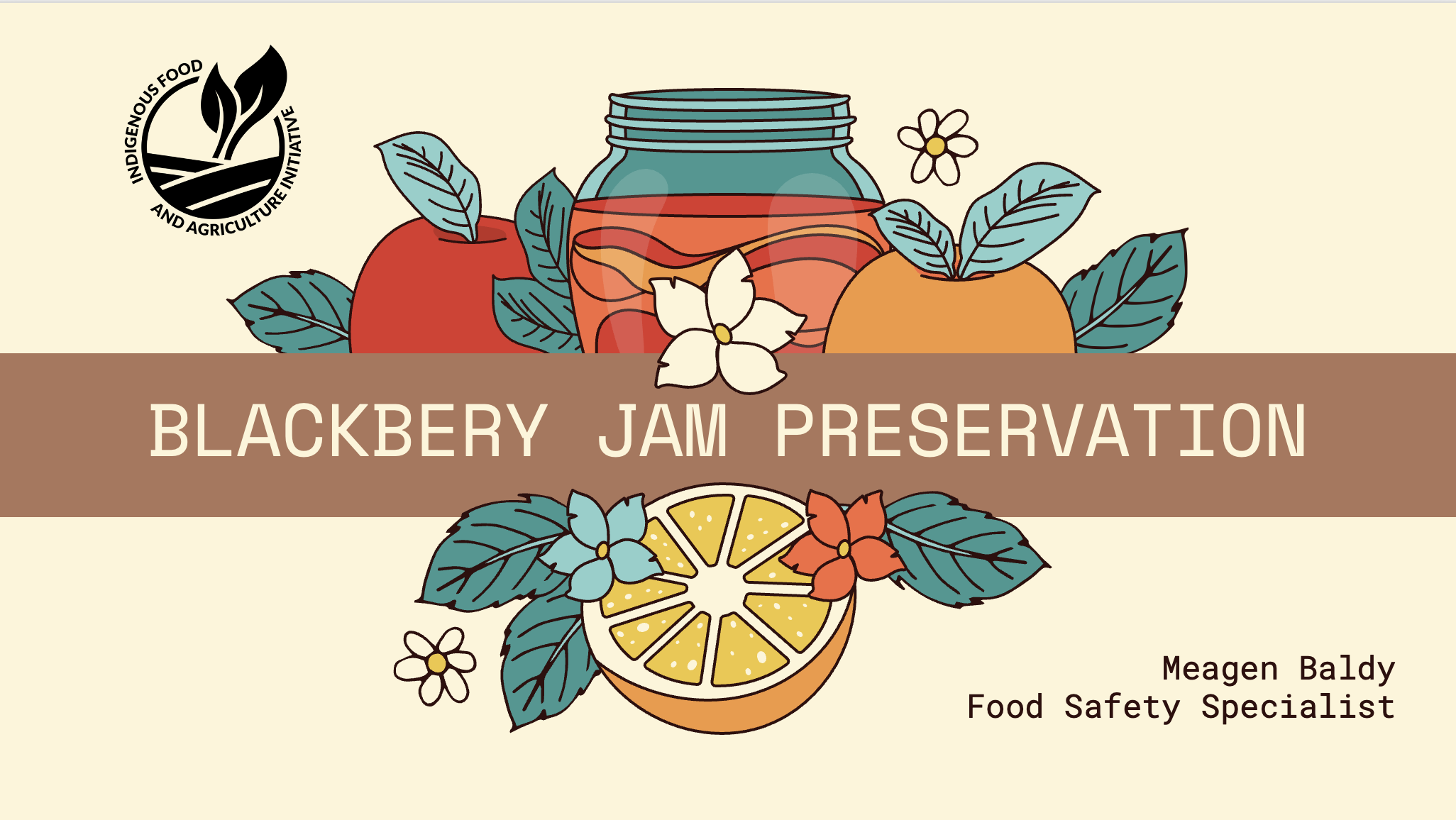 The Indigenous Food and Agriculture Initiative’s Food Safety Specialist, Meagen Baldy (Hupa), provides detailed instruction on how to make blackberry jam and the basics of canning as a food preservation measure. Click the button below to access the webinar slides.