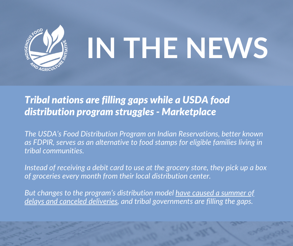 The Indigenous Food and Agriculture Initiative was recently featured on Marketplace regarding the disruptions to the Food Distribution Program on Indian Reservations. Check out a clip of the article below, and click the button at the bottom to read or listen to the entire story.