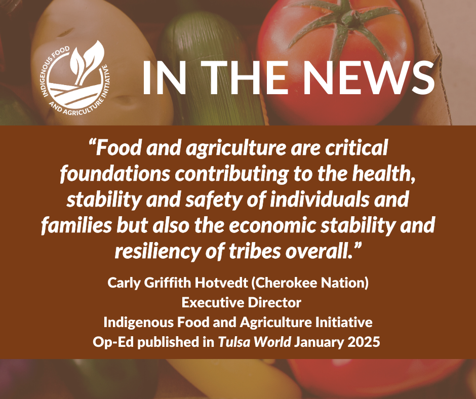 The Tulsa World recently published an op-ed by the Indigenous Food and Agriculture Initiative’s Executive Director, Carly Griffith Hotvedt. In the piece, Griffith Hotvedt highlights the important role food and agriculture play in Tribal sovereignty.
